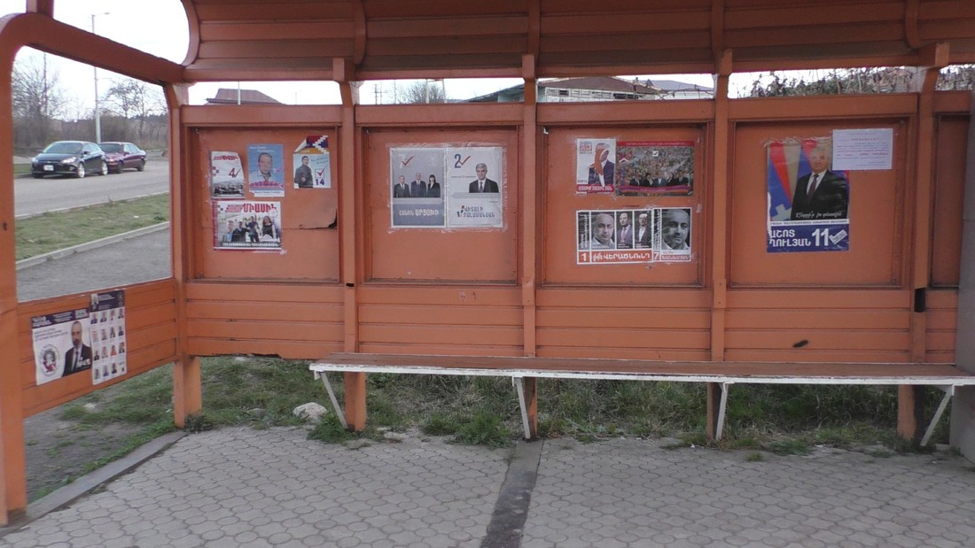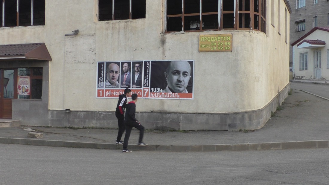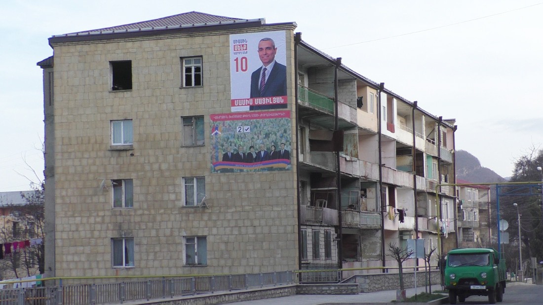 Весь Степанакерт в плакатах претендентов на трон президента и разных партийных деятелях. Я уверен, что если бы кто подал идею, что можно в воздухе голографически собрать лучами портрет претендента, то и на это бы денег не пожалели.