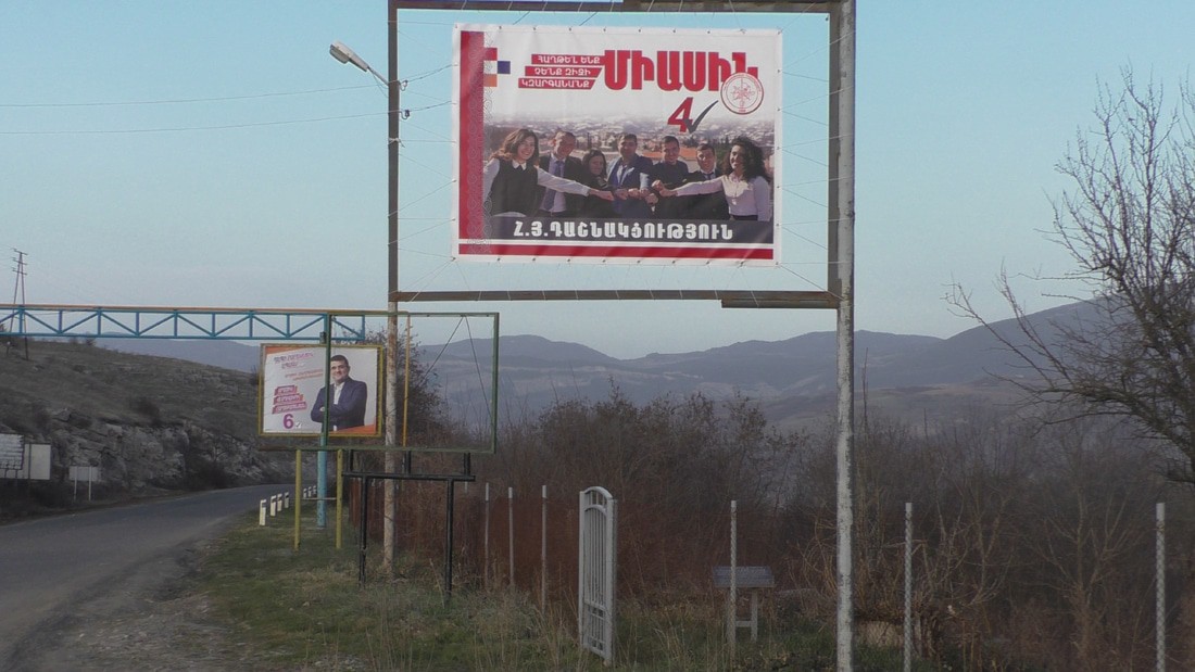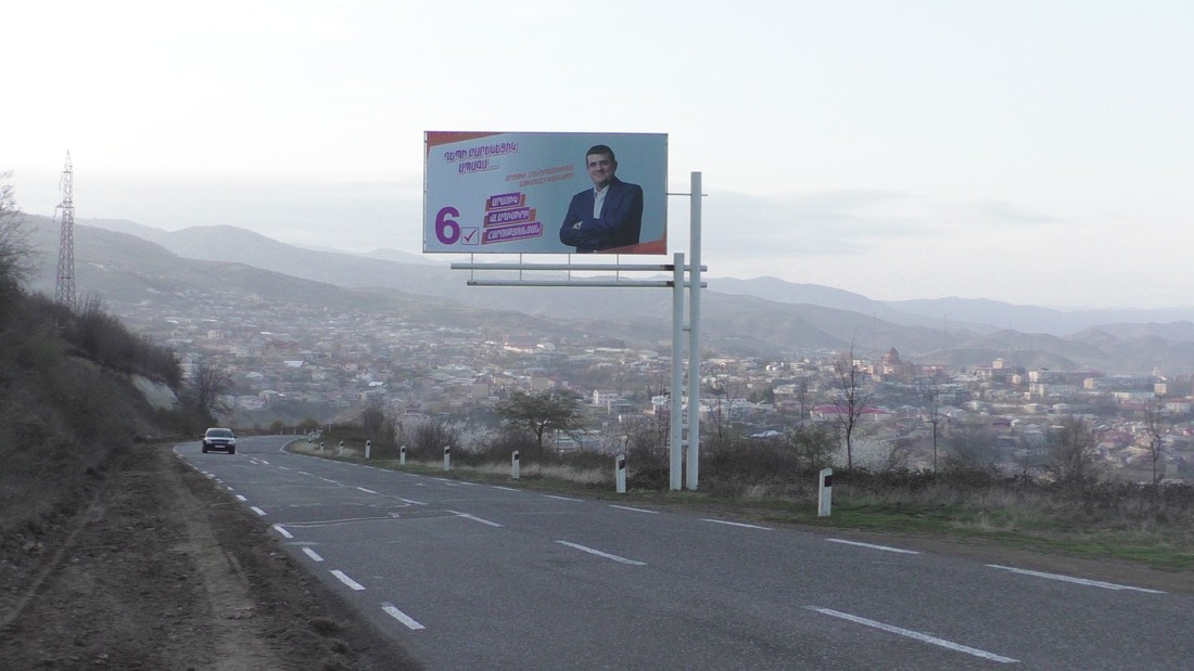 Поехал в Шуши сегодня, там тоже идет война плакатов, причем их столько, что трудно уместить все в одной статье. Уже по дороге, на поворотах меня встретил баннер партии "Азат Айреник" , с оборотной стороны которого поставлено фото Араика Арутюняна.