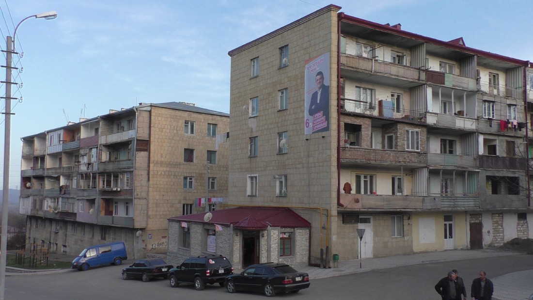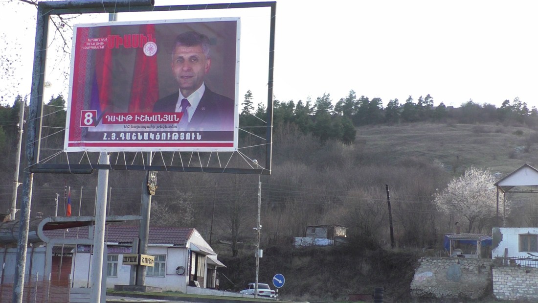 Красиво правда, я имею в виду вид на Степанакерт сверху. Уже на входе в город Шуши я увидел портрет Давида Ишханяна, кандидата от партии "Дашнакцуцюн". Я о нем ничего не писал, т. к. совсем его не знаю, хотя и живем в одном городе, при этом он хочет стать моим президентом. Что ж, скромность тоже немалое достоинство.