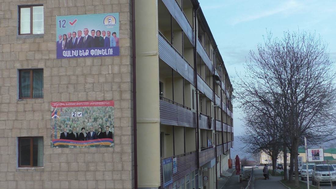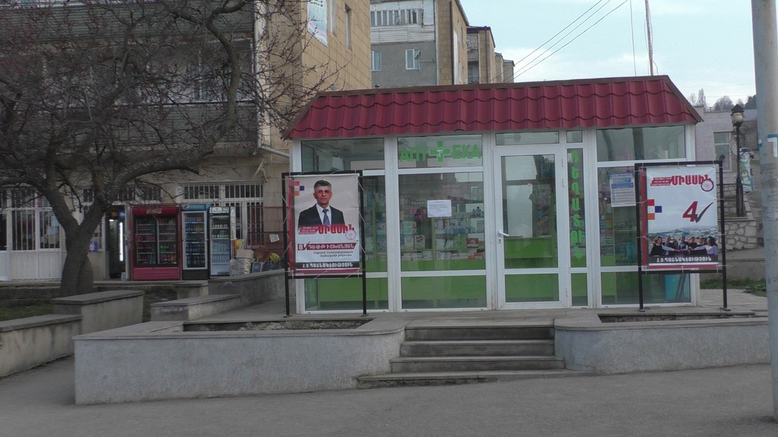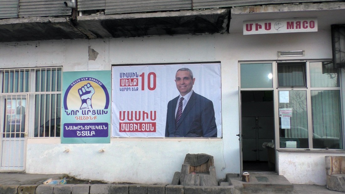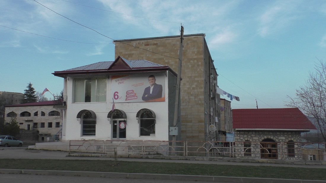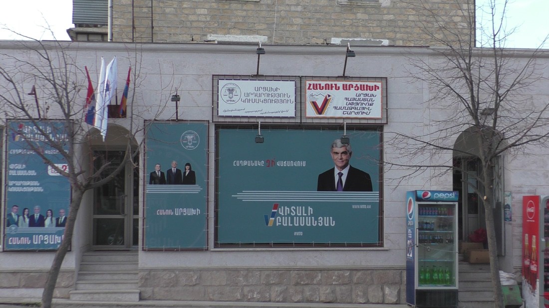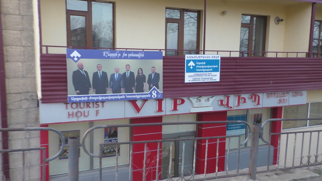Доехал до перекреста (хачмерук по нашему), вот здесь реальный центр Шуши и каждая партия, каждый кандидат постарались отметится своими баннерами. Офис-штаб Виталия Баласаняна. Он в Шуши явно не в первой роли, но завтра поеду в его родной город Аскеран, там наверняка все по другому.