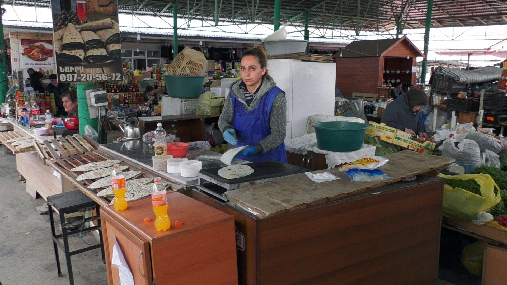 Как заходишь на базар, сразу две точки, где пекут "жингялав hац". Одна точка работает, другая закрыта. Весь базар в этом состоянии - работает наполовину. Продавцы в основном без масок, да и покупатели тоже.
