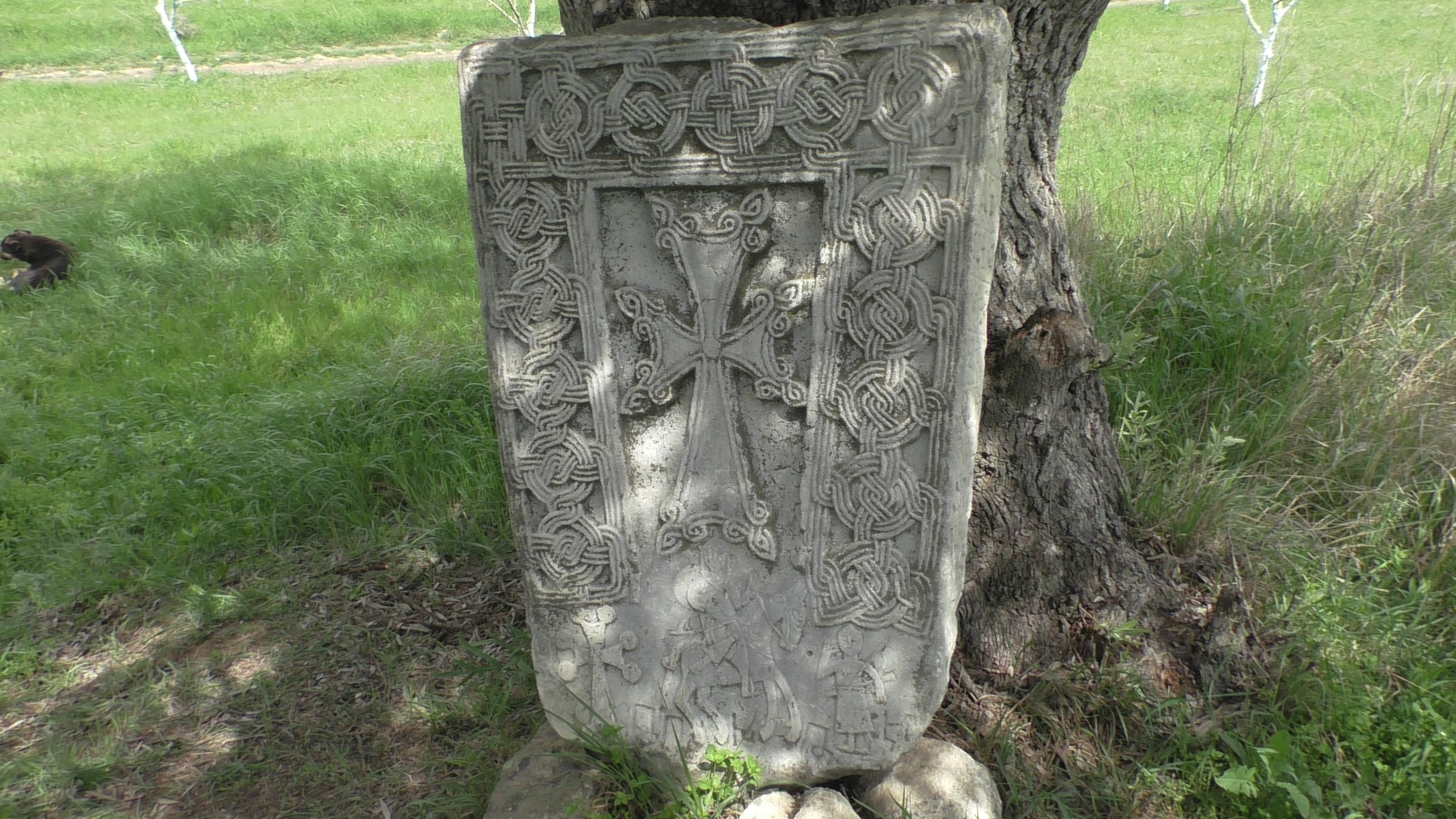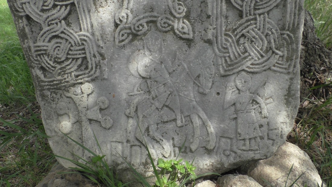 Вот этот хачкар тоже из села Цмакаох. По бокам хачкара, с двух сторон идет надпись, ее можно прочитать, было бы желание. Внизу хачкара, под крестом изображение двух воинов, пешего и всадника. Пеший воин поднял руку, то ли приветствует конника, то ли честь отдает. Остальные подробности откроются тогда, когда надписи на нем прочитают...