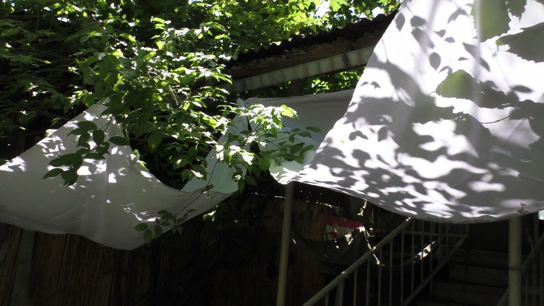 Ветер раскачивает ветки тутового дерева и спелые белые ягоды падают в эти паруса. Да и без ветра самые спелые падают. Дерево шелковицы растет прямо у лестницы, раскинуть под ним большую шаль нет никакой возможности, вот и заменил несколькими маленькими.