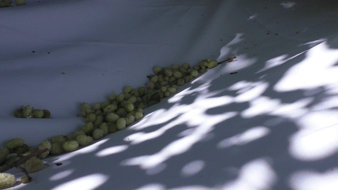За ночь в натянутом под деревом парусе собирается свежий витаминный завтрак и я натощак съедаю большую пиалу тута.